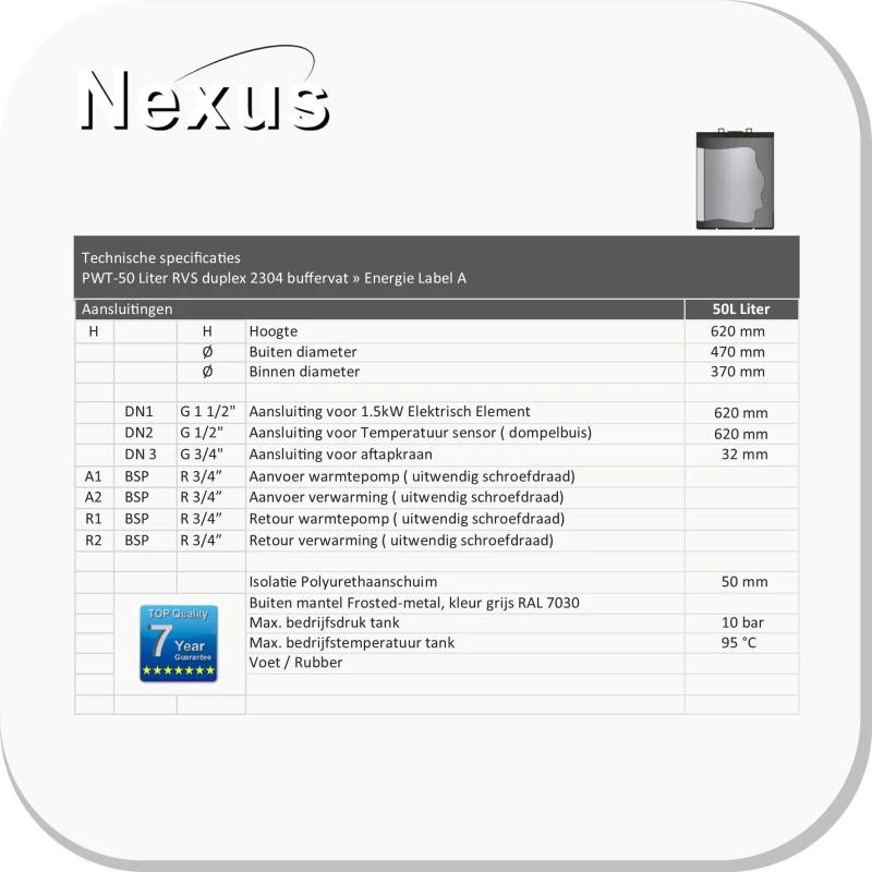 De PWT-50 maakt deel uit van de NEXUS RVS buffertankserie en voldoet aan de productiecontrole volgens de Europese richtlijn 2014/68/EU (module A). Dankzij de geavanceerde lastechniek beschikken deze buffertanks over een internationaal hoog en duurzaam kwaliteitsniveau, gecombineerd met een elegante uitstraling en uitstekende corrosiebestendigheid. Ideaal voor installaties waar bovenaansluitingen en hoogwaardige materiaalkwaliteit gewenst zijn.