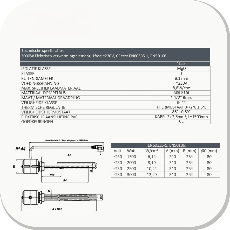 Elektrisch verwarmingselement – 3 kW 230V met thermostaat