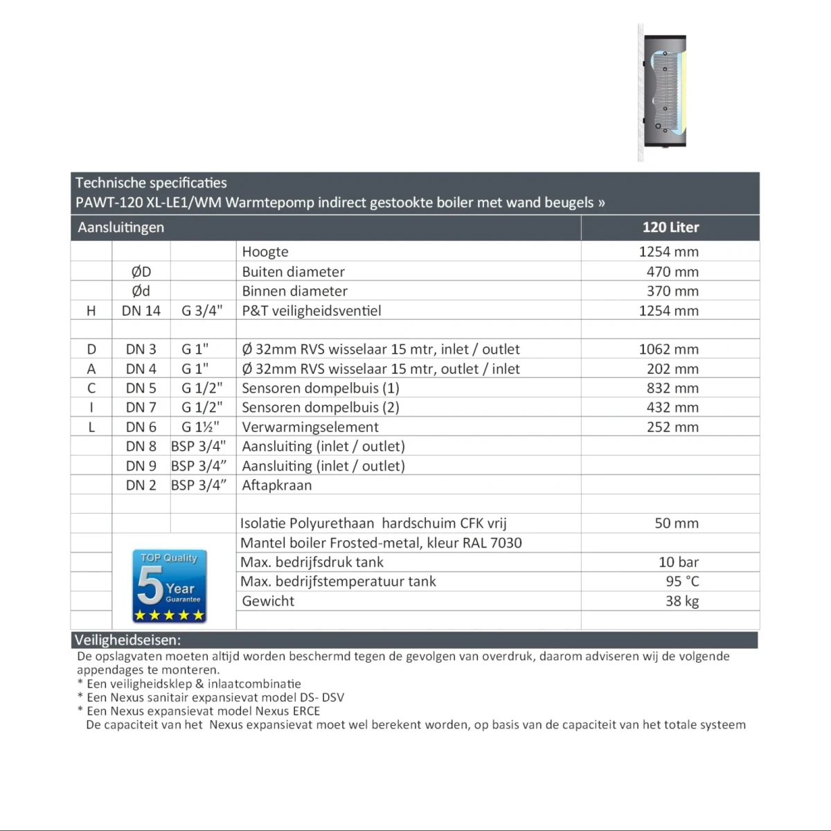 De PAWT-120 XL-LE1 maakt deel uit van de NEXUS RVS serie en voldoet aan de productiecontrole volgens de Europese richtlijn 2014/68/EU (module A). Dankzij de geavanceerde lastechniek beschikken deze boilers over een internationaal hoog en duurzaam kwaliteitsniveau, gecombineerd met een elegante uitstraling en uitstekende corrosiebestendigheid. De compacte verticale wanduitvoering met onderaansluitingen maakt deze boiler bijzonder geschikt voor technische ruimtes met beperkte vloeroppervlakte, zonder concessies te doen aan rendement of prestaties.