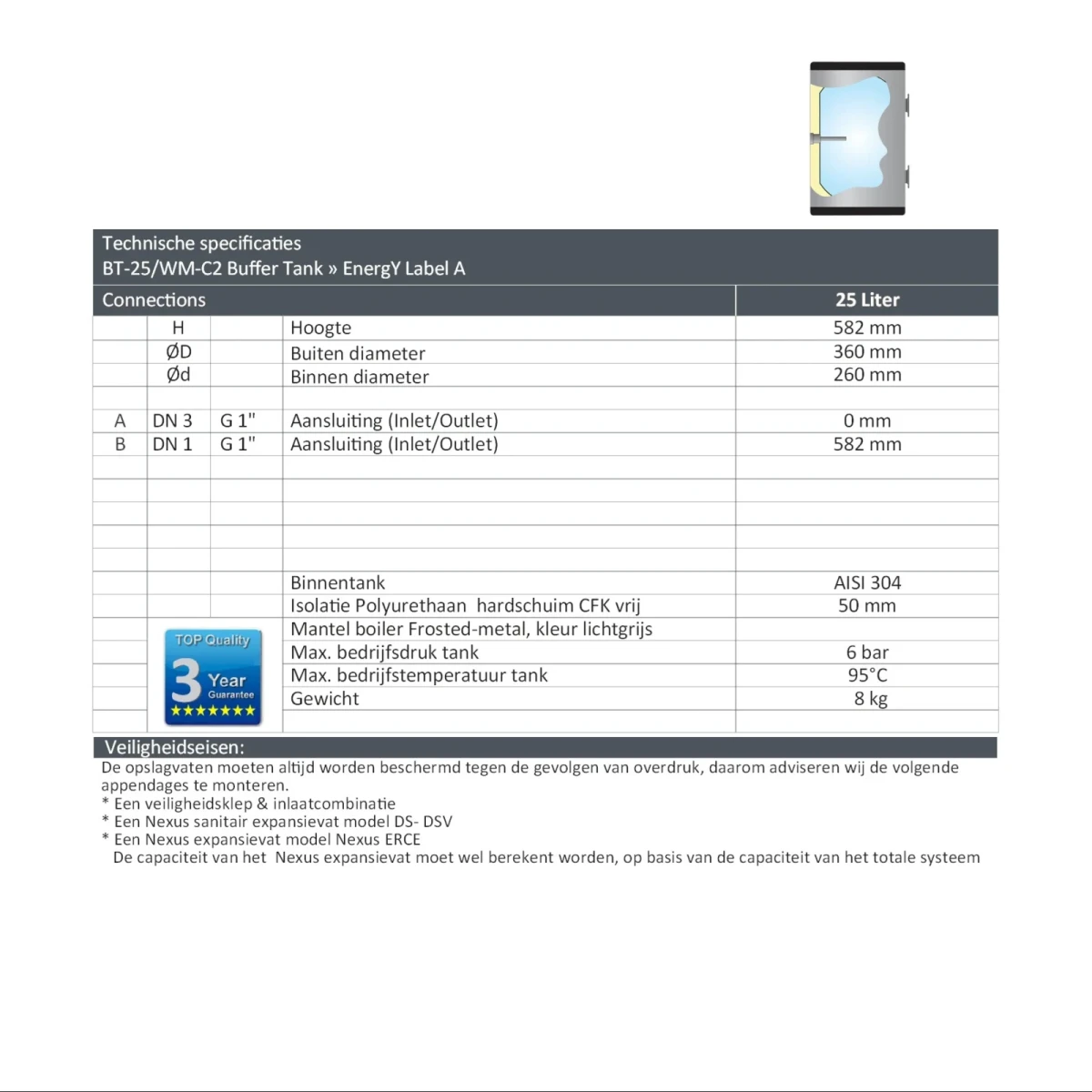 De BT-25 maakt deel uit van de NEXUS RVS buffertankserie en voldoet aan de productiecontrole volgens de Europese richtlijn 2014/68/EU (module A). Dankzij de geavanceerde lastechniek bieden deze buffertanks een hoog en duurzaam kwaliteitsniveau, gecombineerd met een elegante afwerking en uitstekende corrosiebestendigheid. Ideaal als compacte buffer in cv- en warmtepompsystemen.