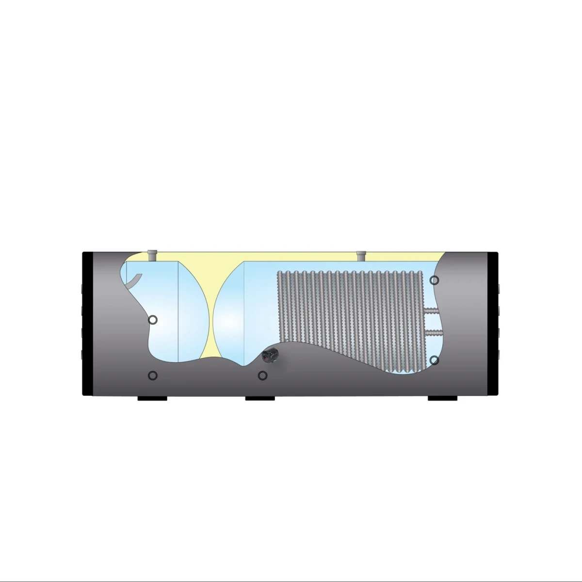 In het bovenste deel van de opslagtank wordt vers water via de RVS warmtewisselaar verwarmd. Het onderste deel buffert de verwarmingsretour en levert energie voor de ontdooicyclus van de warmtepomp.