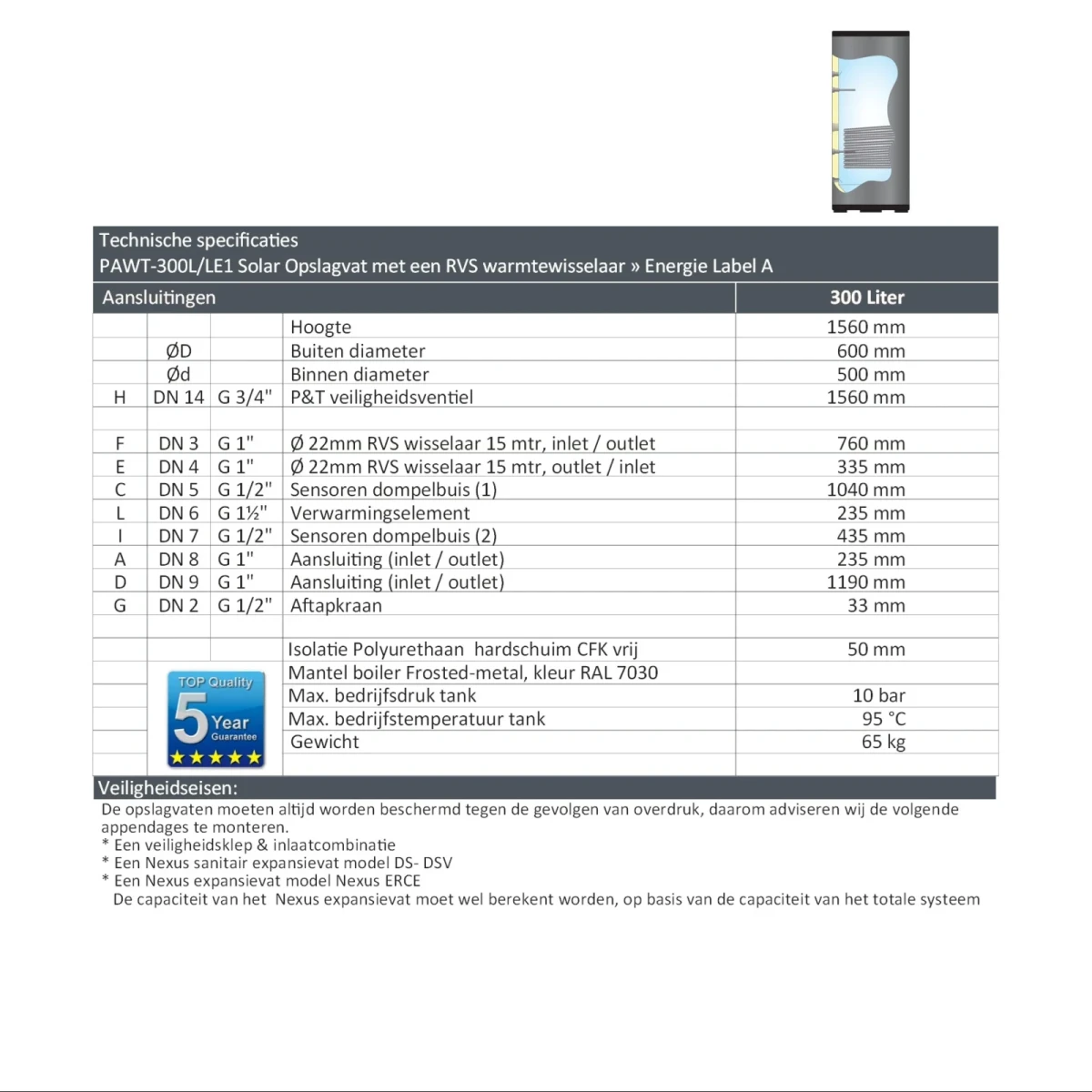 De PAWT-300L/LE1 maakt deel uit van de NEXUS RVS serie en voldoet aan de productiecontrole volgens de Europese richtlijn 2014/68/EU (module A). Dankzij de geavanceerde lastechniek beschikken deze boilers over een internationaal hoog en duurzaam kwaliteitsniveau, gecombineerd met een elegante uitstraling en uitstekende corrosiebestendigheid. Ideaal voor zonneboilersystemen waar capaciteit, rendement en materiaalsterkte centraal staan.