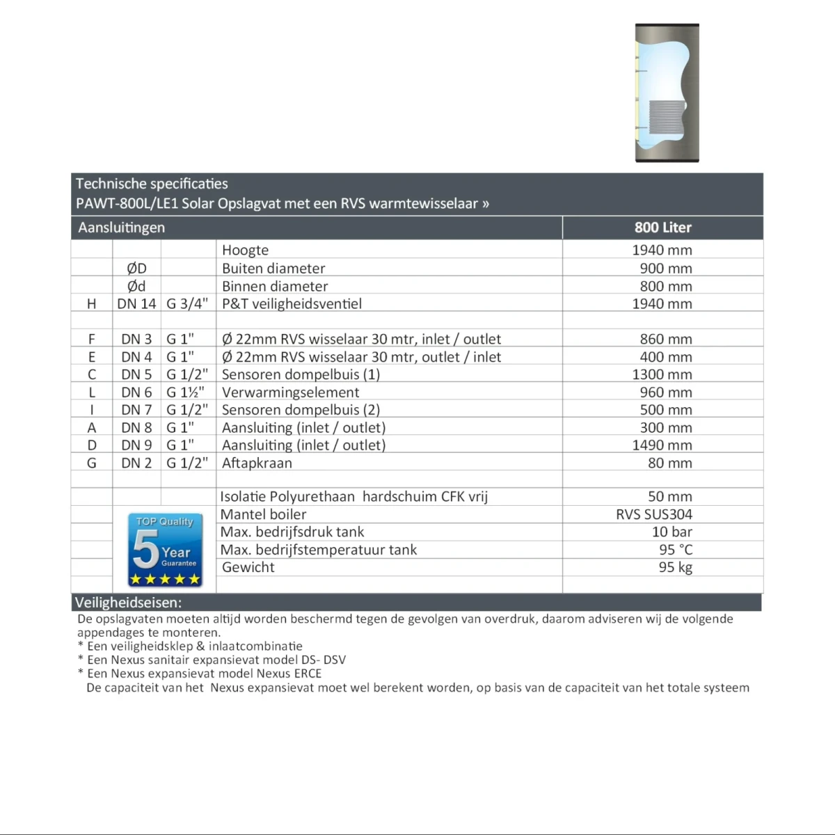 De PAWT-800L/LE1 maakt deel uit van de NEXUS RVS serie en voldoet aan de productiecontrole volgens de Europese richtlijn 2014/68/EU (module A). Dankzij de geavanceerde lastechniek beschikken deze boilers over een internationaal hoog en duurzaam kwaliteitsniveau, gecombineerd met een elegante RVS-afwerking en uitstekende corrosiebestendigheid. Ideaal voor grotere zonneboilerinstallaties waar capaciteit, betrouwbaarheid en efficiëntie centraal staan.
